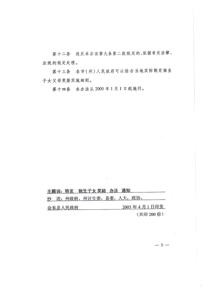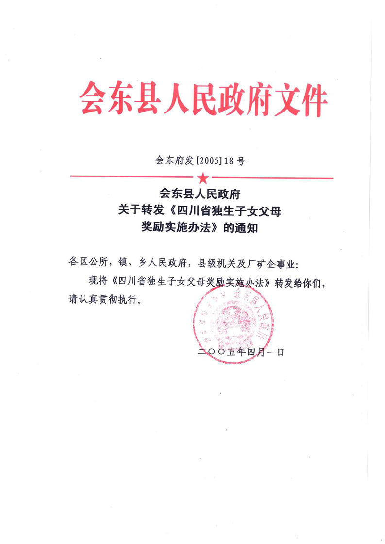 会东县人民政府关于转发《四川省独生子女父母奖励实施办法》的通知