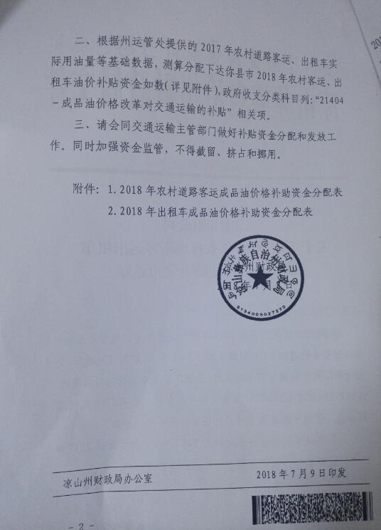 凉山州财政局关于下达2018年农村道路客运出租车成品油价格补助资金的通知