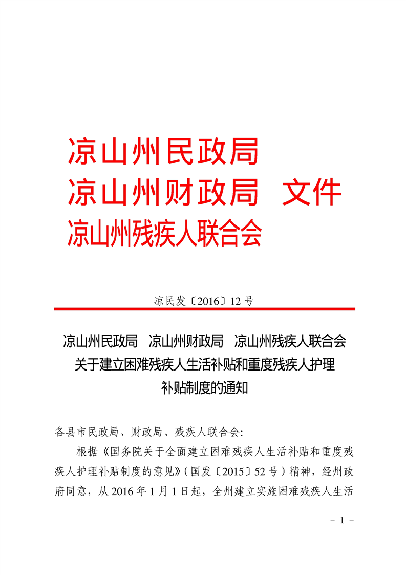 凉山州民政局 凉山州财政局 凉山州残疾人联合会关于建立困难残疾人生活补贴和重度残疾人护理补贴制度的通知