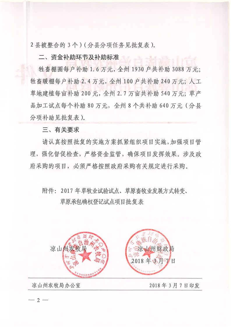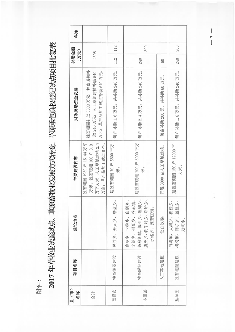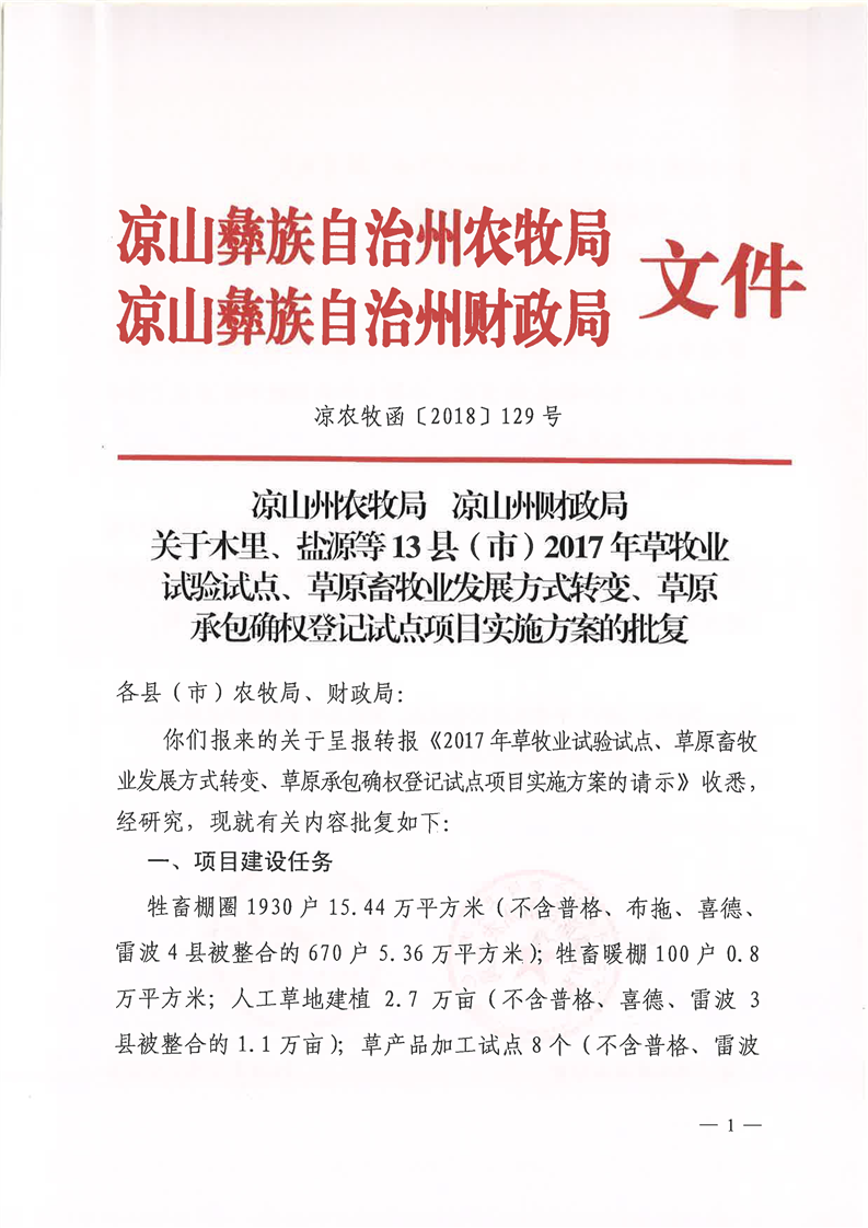 关于木里、盐源等13县(市)2017年草牧业试验试点、草原畜牧业发展方式转变、草原承包确权登记试点项目实施方案的批复