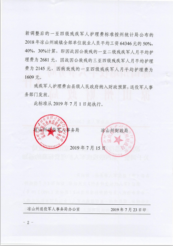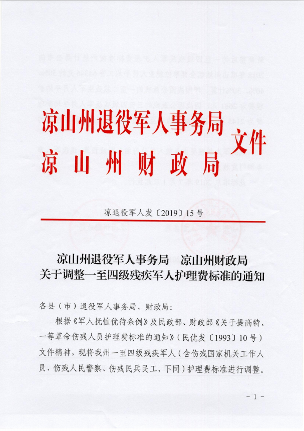 凉山州退役军人事务局 凉山州财政局关于调整一至四级残疾军人护理费标准的通知