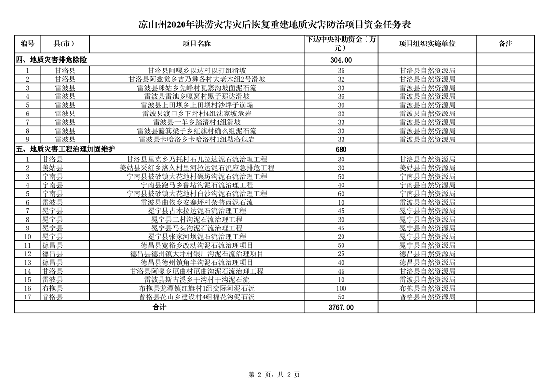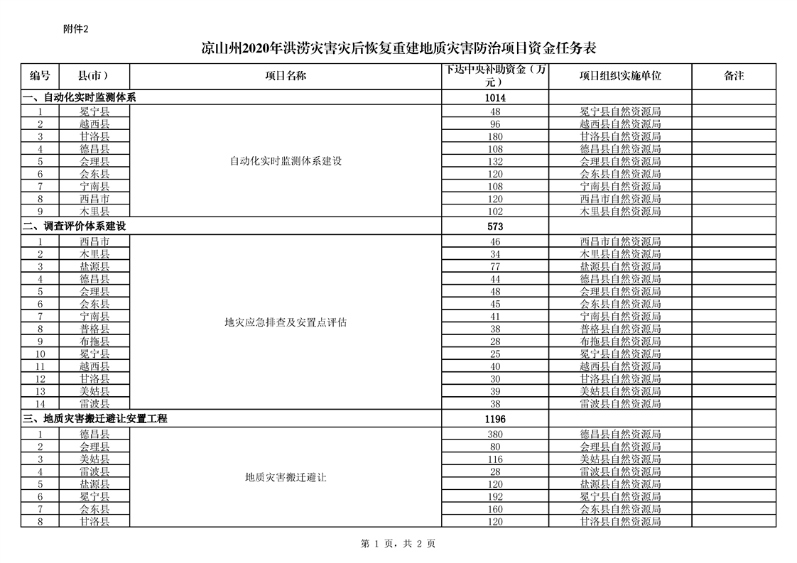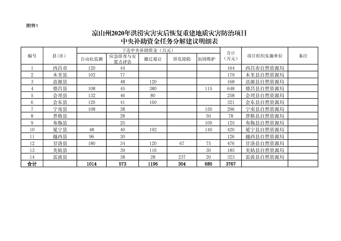 按照《凉山州自然资源局关于凉山州2020年洪涝灾害灾后恢复重建地质灾害防治项目中央补助资金任务分解下达建议函》(凉自然资函[2020] 835号)精神,为促进洪涝灾害灾后恢复重建地质灾害防治项目的顺利实施,确保完成40户受威胁农户的避险搬迁任务,特制定如下实施方案。