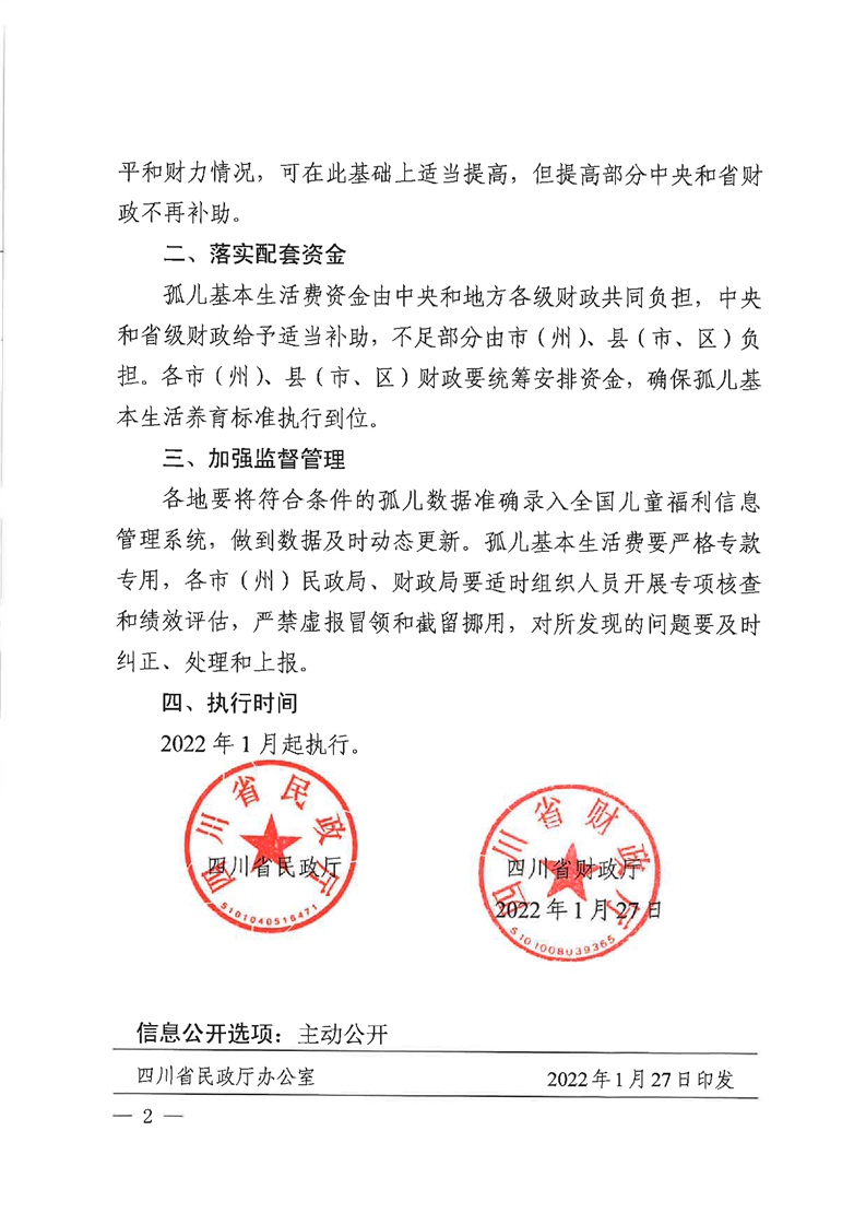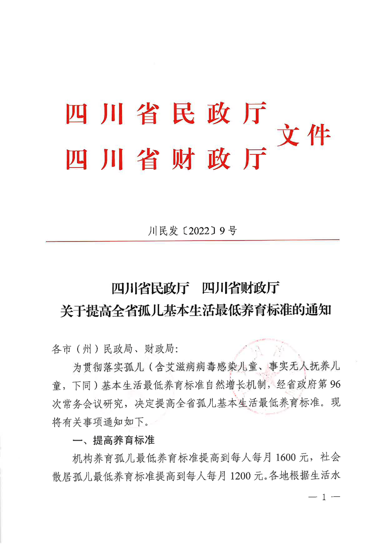四川省民政厅四川省财政厅关于提高孤儿基本生活最低养育标准的通知