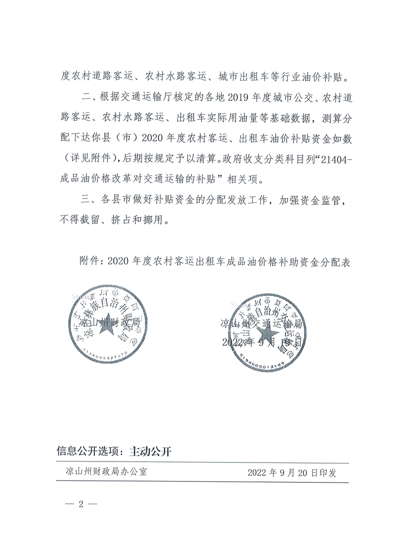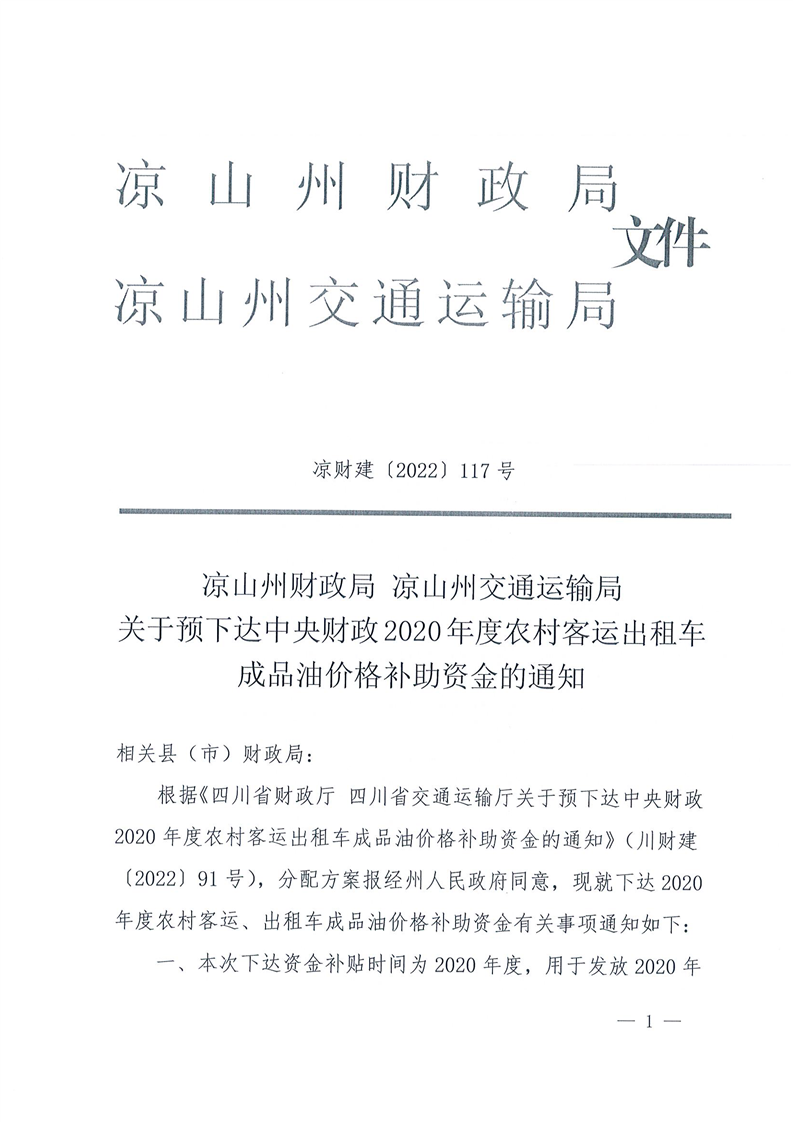 凉山州财政局 凉山州交通运输局关于下达中央财政2020年度农村客运出租车成品油价格补助资金的通知